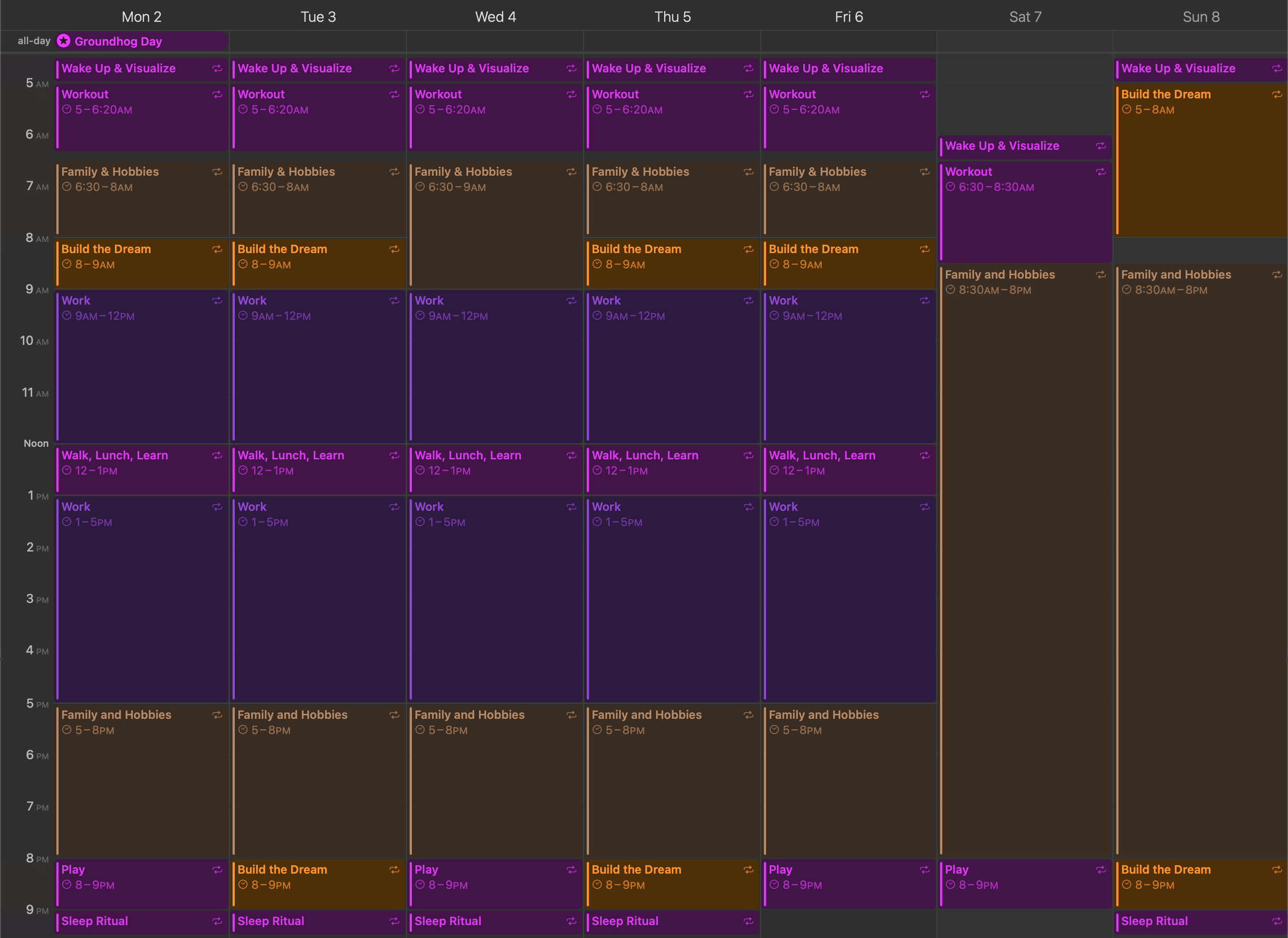 Here is a look at my calendar. This is an ideal state. I’m not showing the 10+ other obligations my wife throws on the calendar in a week. You’ll see. I have 10 hours set aside to “Build My Dream”. That means I can’t put 40 hours of a to-do list on my weekly plan. I only have 10 hours. This helps me filter down to the most important priorities I need to work on.